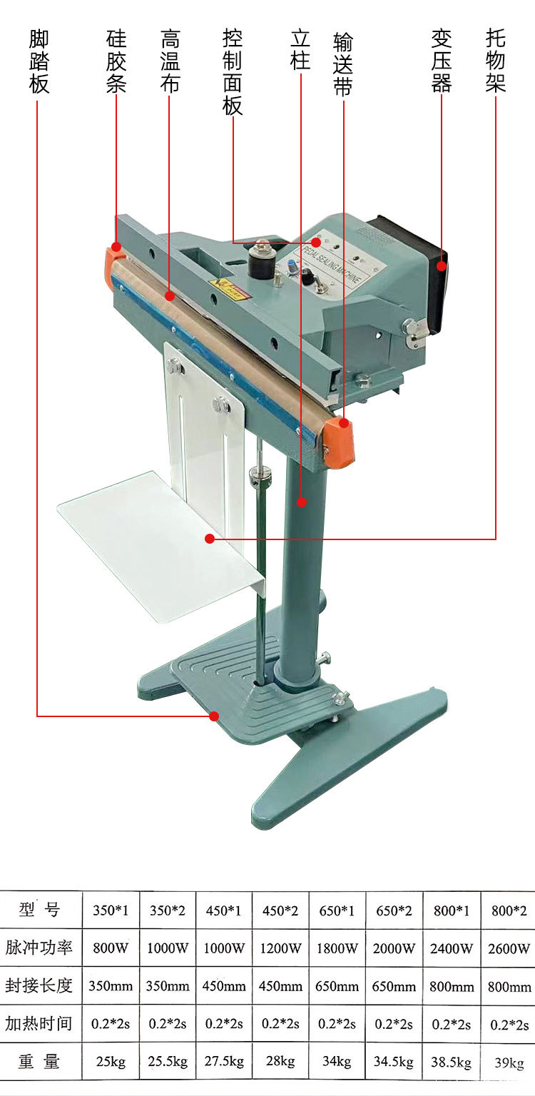 - 腳踏封口機:通常具有專門的腳踏控制機構(gòu)和與之相連的傳動系統(tǒng),結(jié)構(gòu)上會更注重腳踏板與封口部件之間的聯(lián)動性和穩(wěn)定性。為了方便操作人員踩踏,腳踏板的位置和角度一般經(jīng)過精心設(shè)計,而且機身結(jié)構(gòu)可能會相對較高,以適應腳踏操作的空間需求。