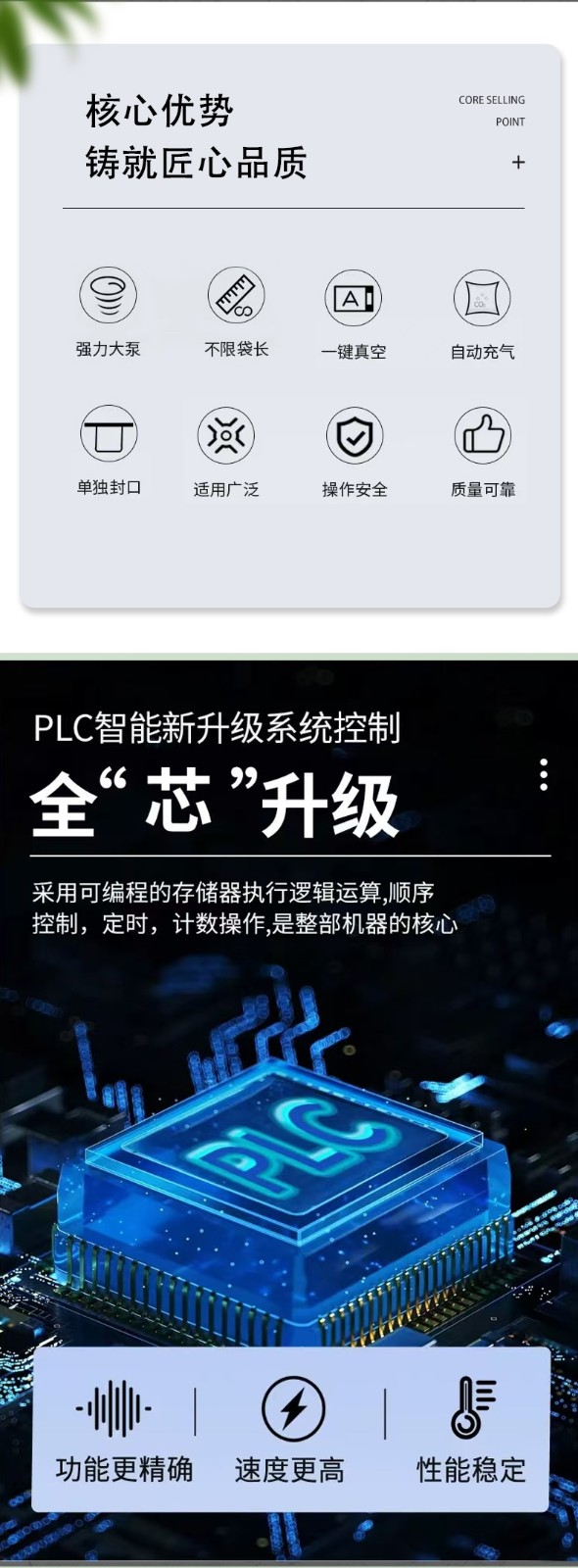 - 內抽式:每次包裝需先將包裝袋放入真空室,抽氣、封口后再取出,包裝周期較長,速度相對較慢,每分鐘可完成 1 - 3 次包裝循環。