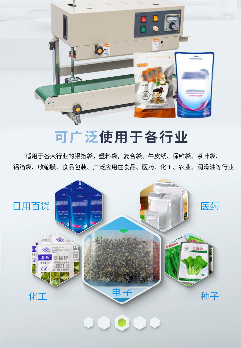 - 食品行業:廣泛應用于大米、面粉、雜糧等糧食類產品,以及堅果、果脯、糖果等休閑食品的包裝封口,能有效防潮、防蟲,保持食品的新鮮度和口感。