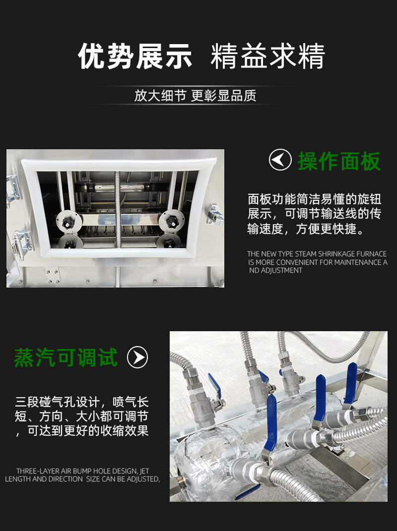 - 蒸汽 - 熱風混合加熱型:結合了蒸汽和熱風兩種加熱方式。在工作時,先利用蒸汽使包裝膜初步收縮,然后通過熱風進一步干燥和加固收縮效果。這種類型適用于一些對包裝強度和干燥程度要求較高的產品,如電子產品的包裝。因為電子產品通常需要在干燥的環境下包裝,避免受潮,混合加熱方式可以在保證收縮效果的同時,使包裝內部更加干燥。