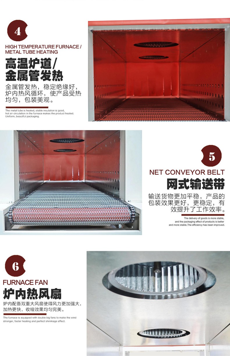 • 產(chǎn)品放置與包裝:將用熱收縮薄膜包裹好的產(chǎn)品放在輸送帶上,注意產(chǎn)品之間要保持一定的間距,避免在收縮過(guò)程中相互粘連。啟動(dòng)輸送帶,將產(chǎn)品勻速地輸送進(jìn)加熱通道。在輸送過(guò)程中,要確保產(chǎn)品位于輸送帶的中心位置,以保證熱空氣能夠均勻地作用于薄膜。