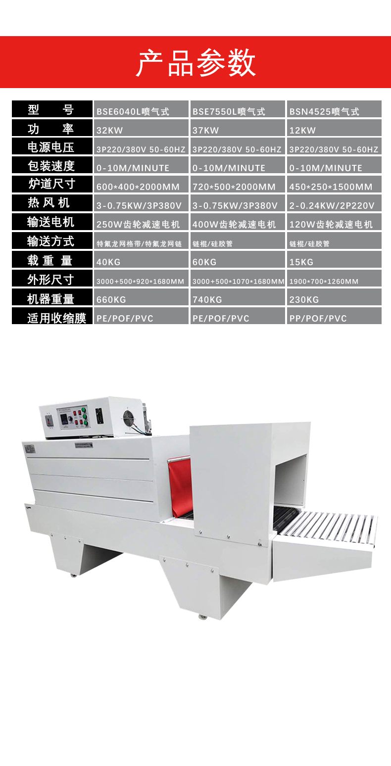 • 輸送速度:輸送速度決定了產(chǎn)品在加熱通道內(nèi)的停留時(shí)間,從而影響薄膜的收縮效果。輸送速度一般在 0.5 - 10 米 / 分鐘之間可變。對(duì)于大型、復(fù)雜形狀或需要充分收縮的產(chǎn)品,通常會(huì)采用較慢的輸送速度,以保證足夠的加熱時(shí)間;而對(duì)于小型、簡(jiǎn)單形狀的產(chǎn)品,可以適當(dāng)提高輸送速度來(lái)提高包裝效率。