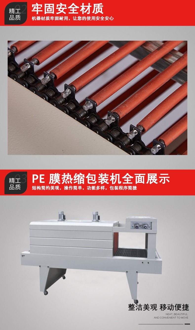 - 主要包括輸送帶和驅動電機。輸送帶用于承載并輸送被 PE 薄膜包裹的產品通過加熱區域。驅動電機控制輸送帶的速度,這個速度是可以調節的。其重要性在于確保產品在加熱區域停留足夠的時間,讓 PE 薄膜充分收縮。例如,如果輸送帶速度太快,PE 薄膜可能來不及完全收縮就離開了加熱區域,導致包裝質量不佳;如果速度太慢,又會影響包裝效率。