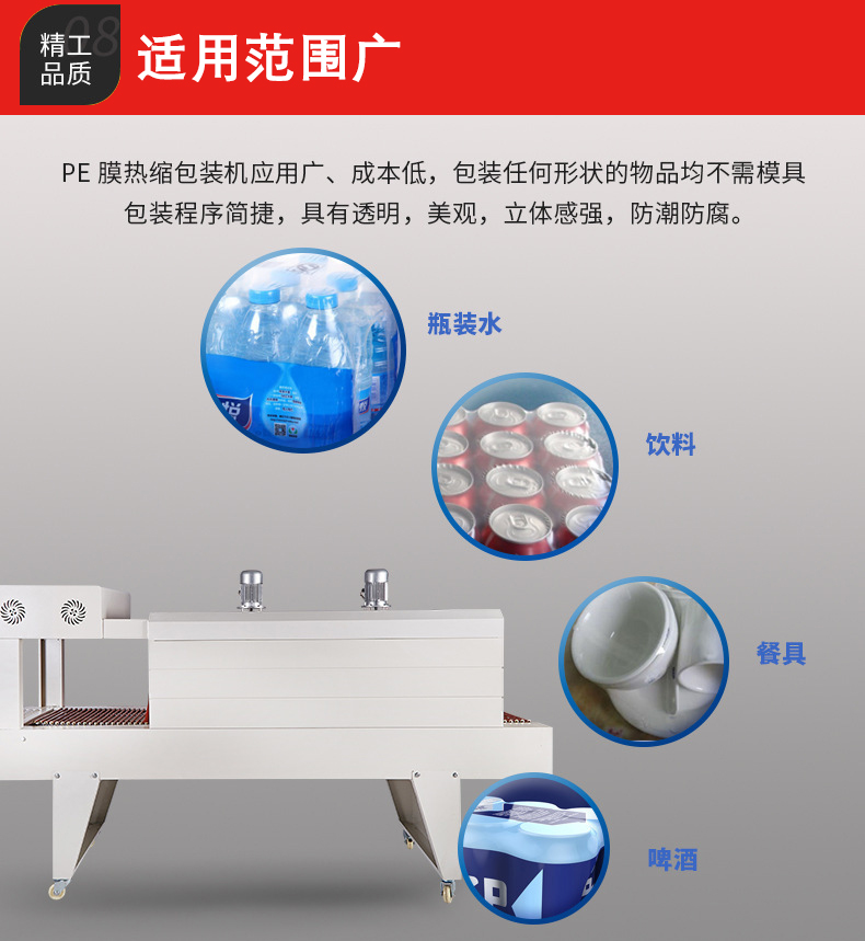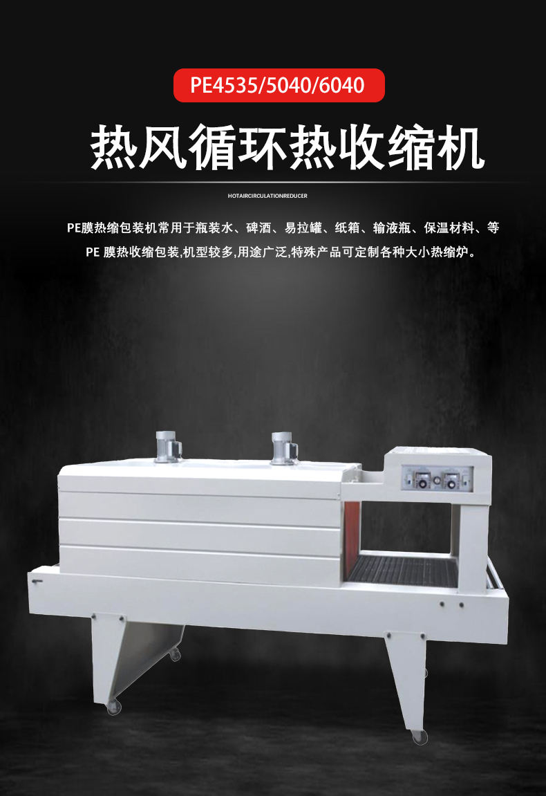 - PE 薄膜本身具有良好的柔韌性,再加上 PE 熱收縮機可以通過調節輸送速度、加熱溫度等參數,使得它能夠對各種形狀(如圓形、方形、不規則形狀)和尺寸的產品進行包裝。例如,無論是包裝小型的文具,還是大型的工業零部件,PE 熱收縮機都能發揮作用。