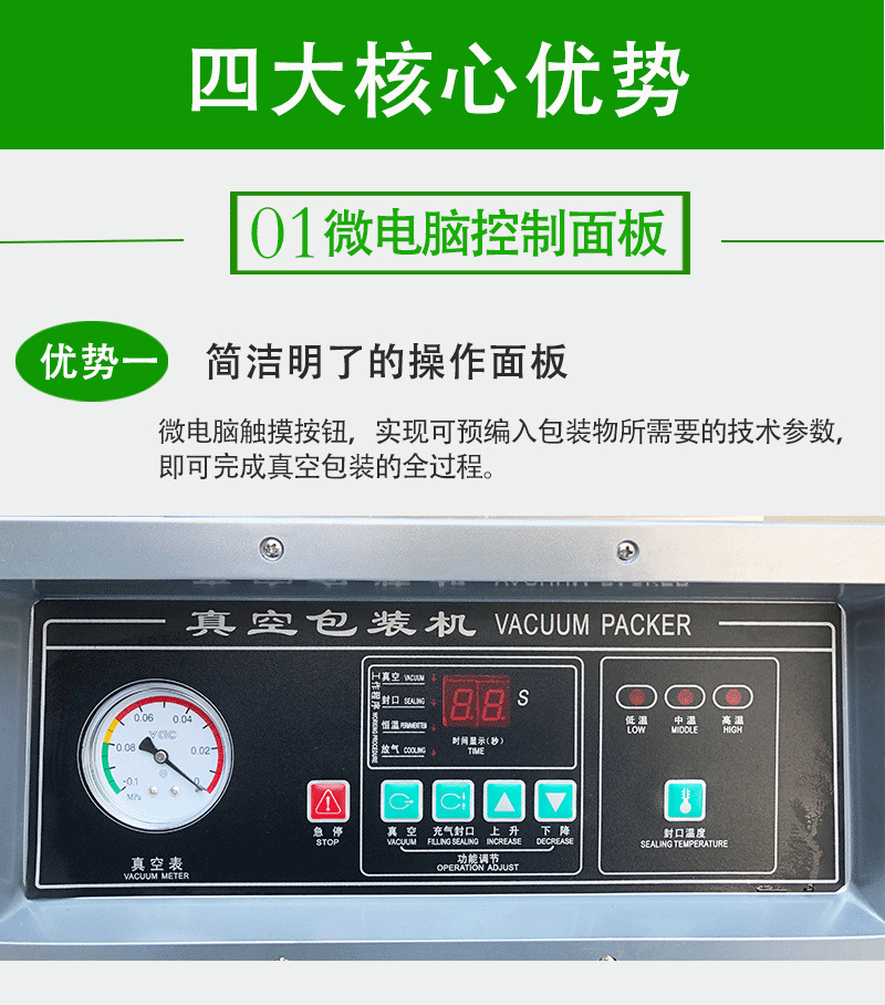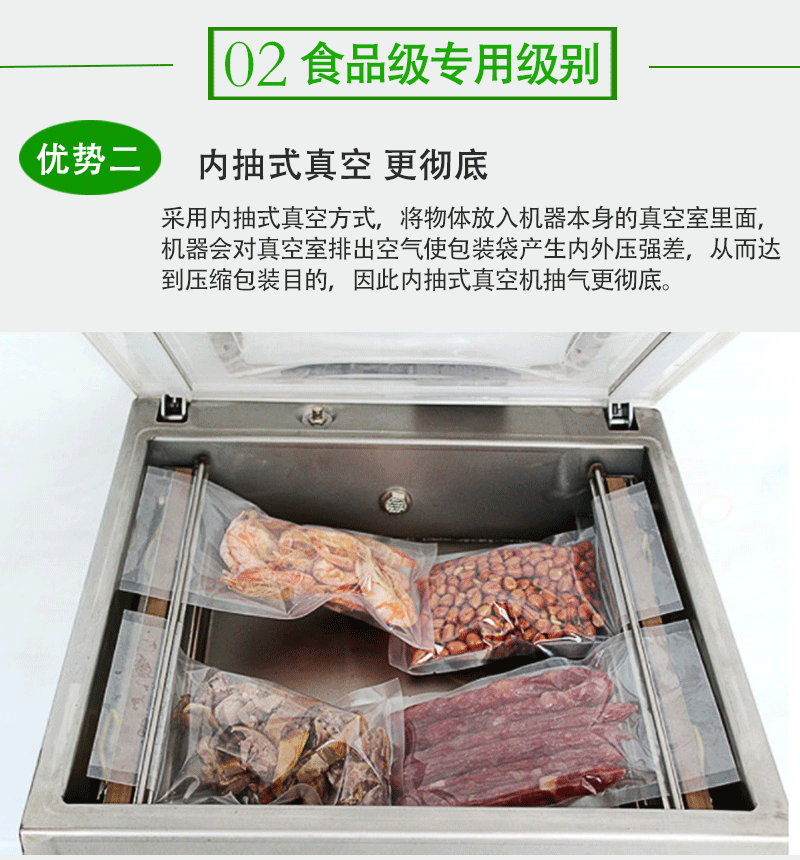 真空包裝機包括食品真空包裝機都是由真空系統、抽充氣密封系統、熱壓封合系統、電器控制系統等組成。外抽式真空包裝機是將包裝袋內抽成低真空后,當即自動封口,由于袋內真空度高,殘留空氣極少,抑制細菌等微生物的繁殖,避免了物品氧化、霉變和