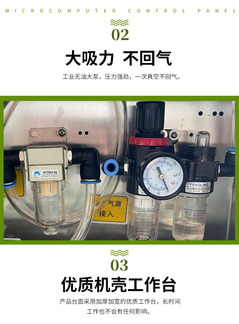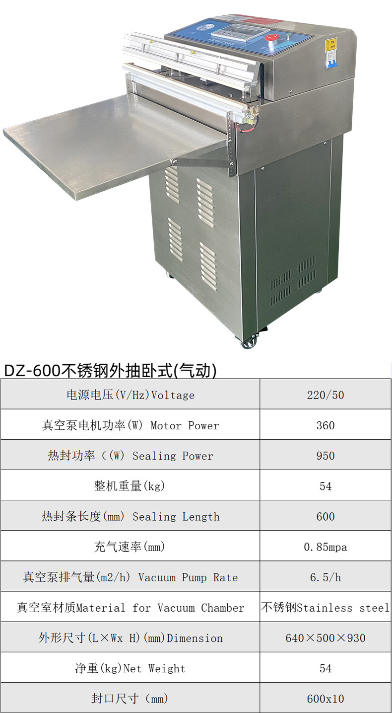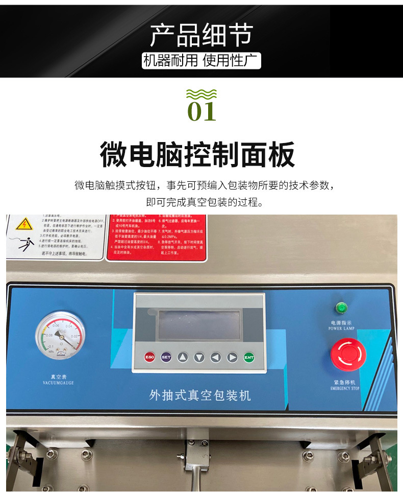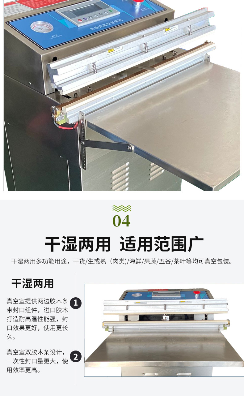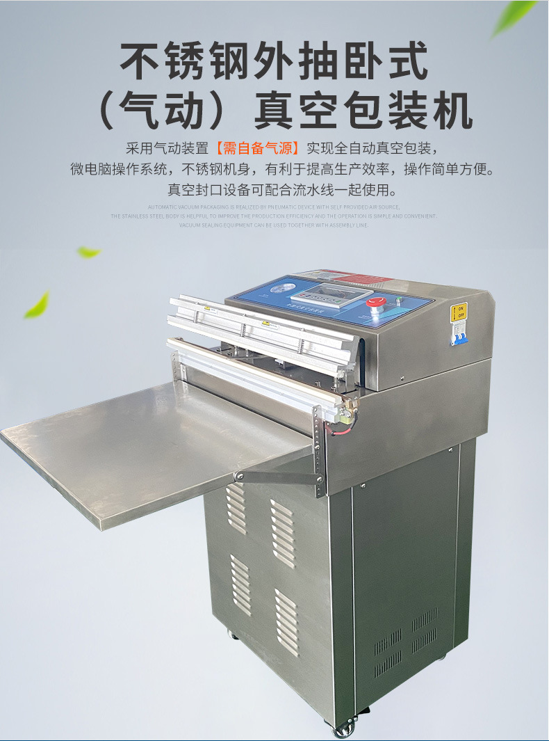 真空包裝機能夠自動抽出包裝袋內的空氣,達到預定真空度后完成封口工序。亦可再充入氮氣或其它混合氣體,然后完成封口工序。真空包裝機常被用于食品行業,因為經過真空包裝以后,食品能夠抗氧化,從而達到長期保存的目的。