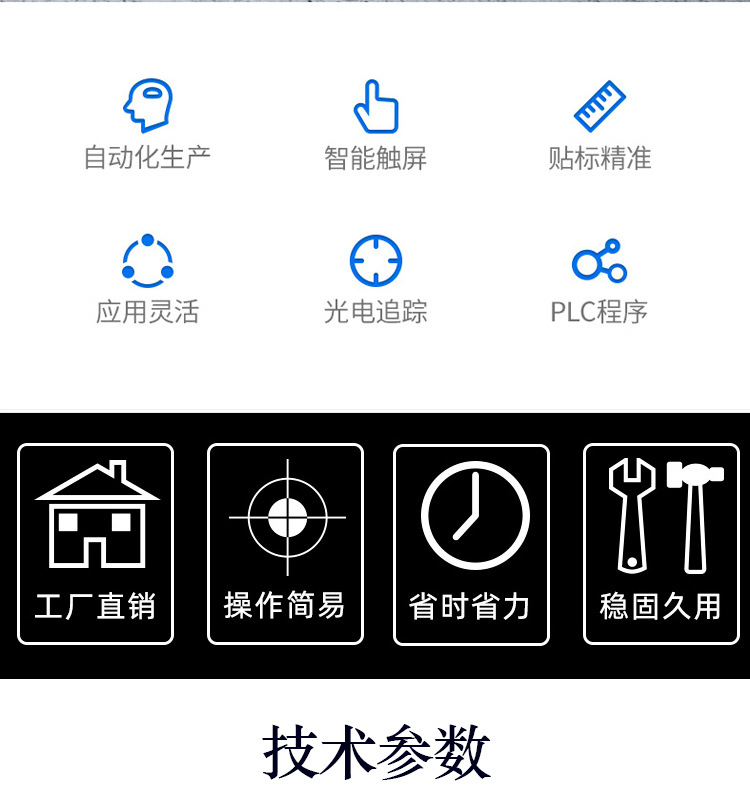 實現在工件的上平面、上弧面的貼標簽和貼膜,如盒子、書本、塑膠殼等,有滾貼和吸貼兩種方法,主要根據效率、精度和氣泡要求進行選型。 圓瓶類貼標機實現在圓柱形、圓錐形產品的圓周面上貼標簽或貼膜,如玻璃瓶、塑料瓶等,可實現圓周、半圓周、圓周雙面、圓周定位貼標等功能,主要有立式貼標和臥式貼標兩種方式。