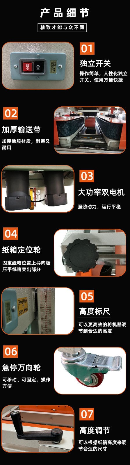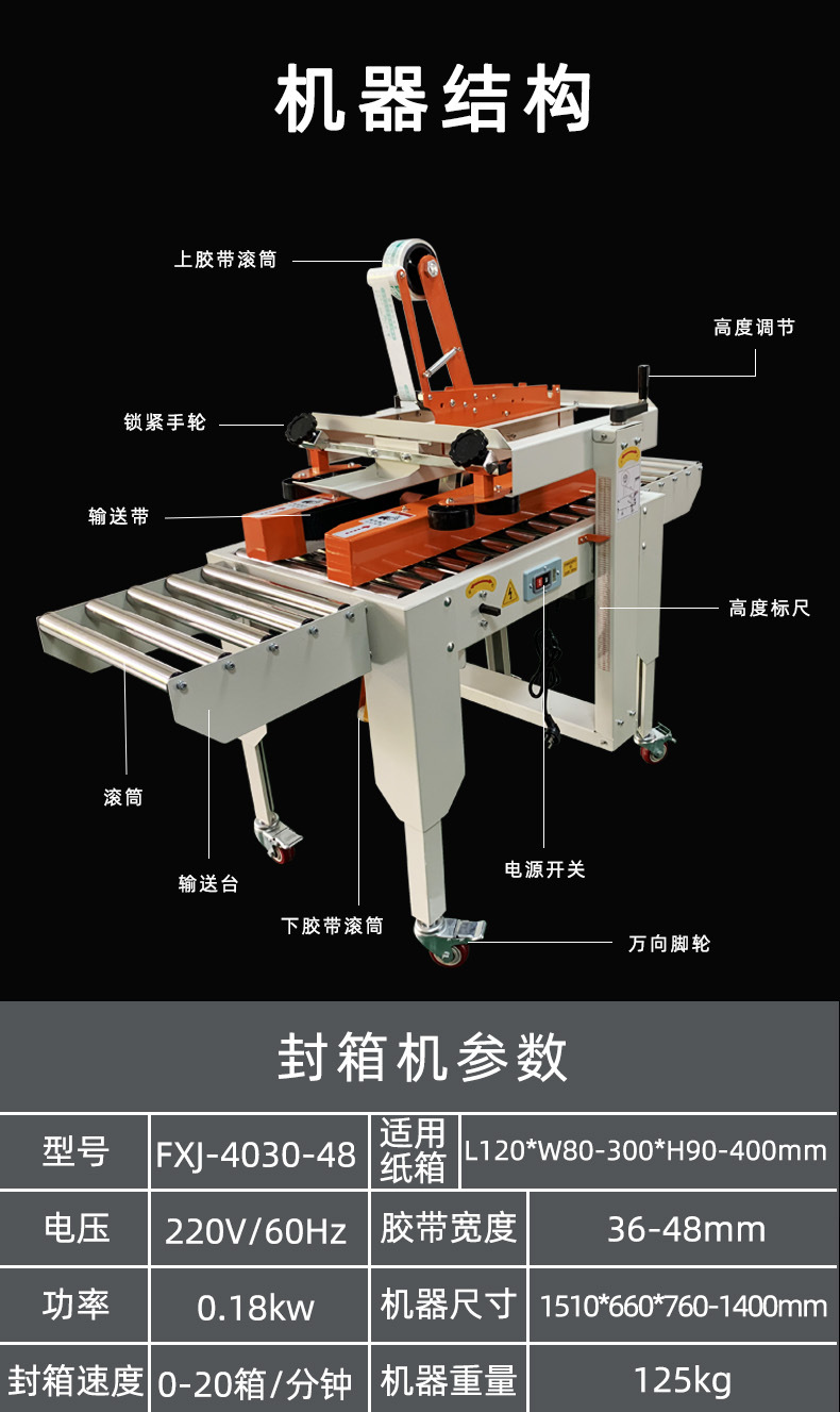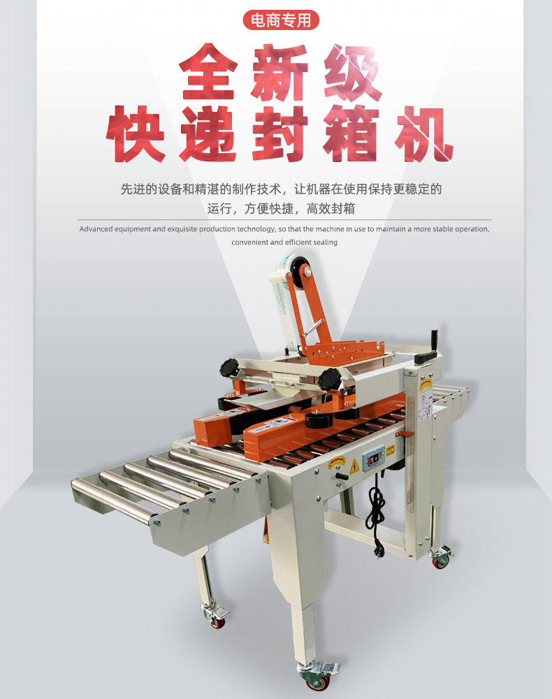 封箱機是一種用于紙箱封箱包裝的設備,主要適用于紙箱的封箱包裝,既可單機作業,也可與流水線配套使用。它可單箱作業,也可與紙箱成型開箱機、裝箱機、貼標機、捆包機、棧板堆疊機、輸送機等設備配套成包裝流水線使用,為包裝流水線作業必須的設備。封箱機的主要分類包括自動拆蓋封箱機系列、氣動調整封箱機系列、自動封箱機系列、邊角式封箱機系列、四角邊封箱機、工字型封箱等,封箱方式可分為上下驅動、左右驅動、側邊、角邊等,一般采用透明膠帶以及牛皮紙材料。